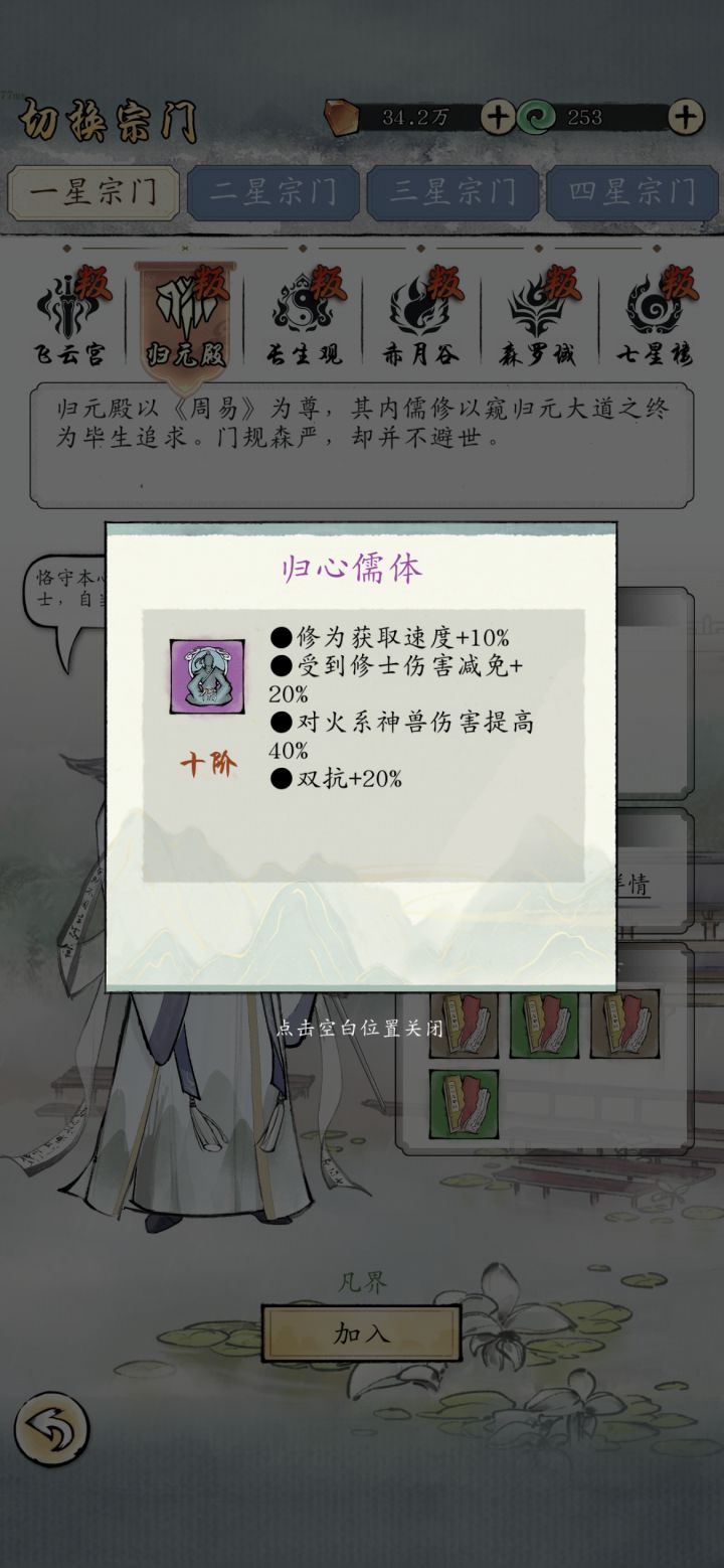 多说无益,直接上干货1.关于宗门,重要[酷],开局宗门不要选归元殿和长生观宗门等级达到真传弟子在禁地会有幻境时空归元殿-归心儒体(0氪前期可以一直用3个月)长生观-长生灵体(增加宗门日常任务贡献基数)建议第一个选另外三个,1000贡献买了玉简拿了伴侣直接判门第二个选归元殿,拿到直接拉满,可以带到快毕业第三个选长生观,拿了长生灵体,判门速度会增加所以第一天不要选择这两个宗门,在做主线