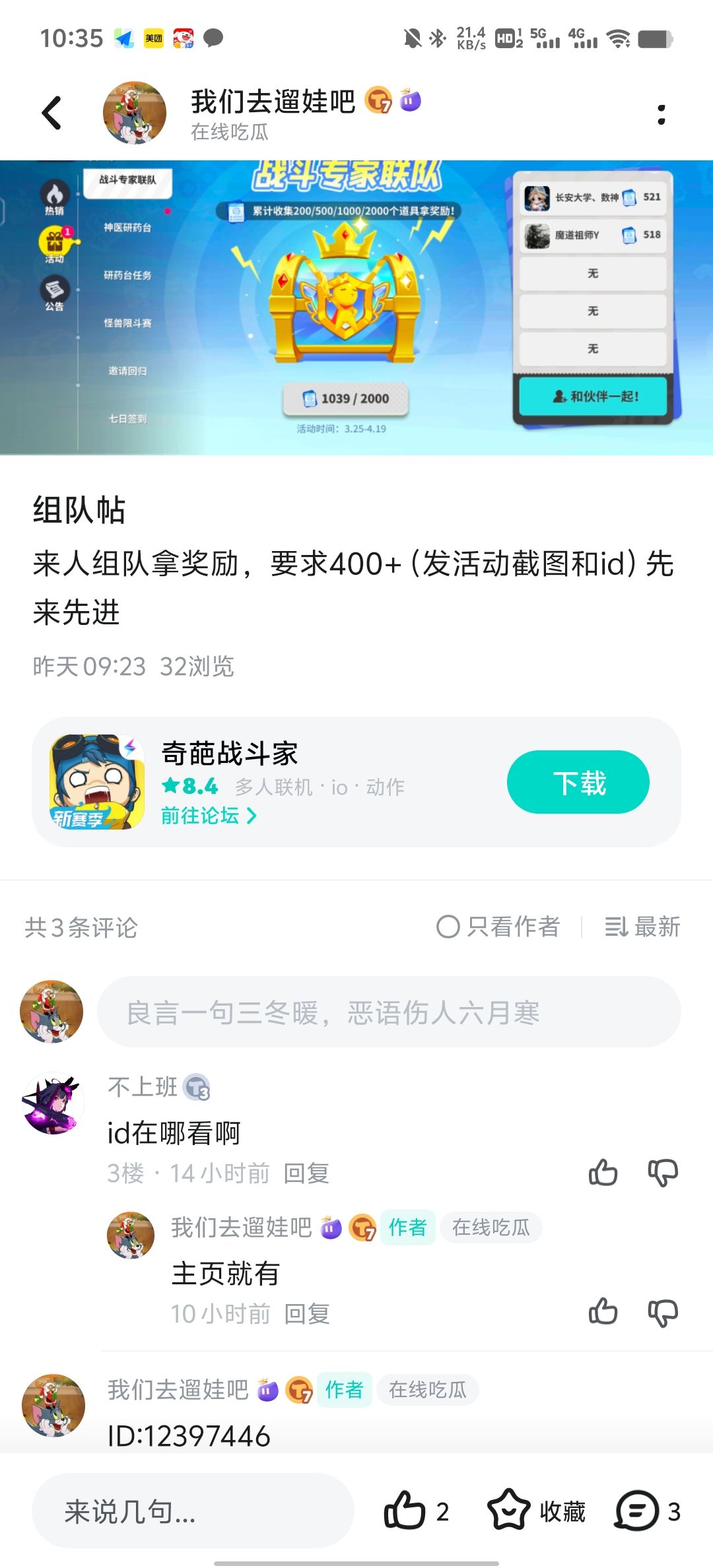 请中奖玩家7日内联系QQ:78958528 提供活动贴个人回复楼层截图、taptap个人主页截图 领取礼包码 喜迎六一 《奇葩战斗家》推出了丰富的线上活动! 玩家在参与完成线上活动的同时记得截图分享到评论区,有机会获得额外奖励哦! 【活动时间】: 6月1日-6月8日 【参与方式】: 游戏内参与完成任意六一活动内容并截图发布至评论区(随机抽取10位中奖玩家) 【活动奖励】: 【活动规则】: 1、有效
