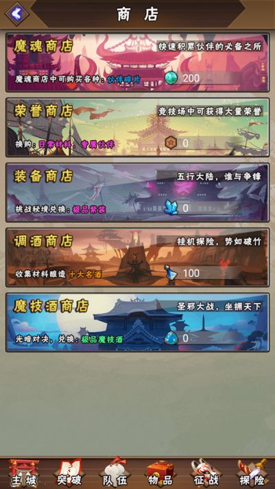游戏内的商店,是提供重要交易的场所,由魔魂商店、荣誉商店、装备商店、调酒商店所构建成。魔魂商店:快速累积伙伴的必备之所,出售各类紫色伙伴碎片。每天共有55次刷新机会,前三次免费刷新,提升贵族等级可增加额外刷新次数。刷新一次消耗100魔魂。魔魂获取途径来自伙伴分解系统,或完成游戏内其他任务和副本可得,还可在矿洞内采集。荣誉商店:出售日常材料及专属紫色伙伴、装备碎片。日常材料包括魔核、天之玉尘粉、