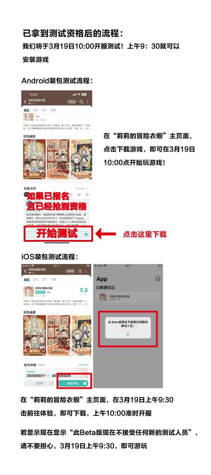 由于首次在平台上测试很多流程发的并不准确,导致很多人看错了参与方式。 我们增加了1000个名额来补偿报了名(预约不是报名)却没有及时参与的宝宝们。在今天下午六点,大家准时去领取自己的名额。 下午18:00,准点开放1000名测试资格,先到先得(不是抽奖,不是抽奖),时间截止到明天下午18:00。#莉莉的冒险衣橱 #莉莉的冒险衣橱测试