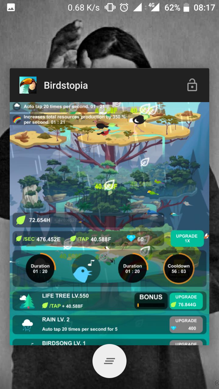 我们童年的时候都学过巴金先生的《鸟的天堂》。文章中描述充满生命力的大榕树和鸟儿,让我们充满了对大自然的向往。今天推荐的游戏《鸟的天堂》,和巴金先生文章中描述的鸟的天堂颇有相似之处。或许我们少有机会能亲眼看看那株大榕树,但通过游戏,我们能感受到大自然和鸟类的美丽,或许也能感受到先生当时喜悦的心情。《鸟的天堂》是一款点击&放置类游戏。点击主场景的大树可以获得「树叶」图标的能量,积攒并消费能量一方面