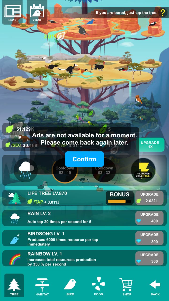 我们童年的时候都学过巴金先生的《鸟的天堂》。文章中描述充满生命力的大榕树和鸟儿,让我们充满了对大自然的向往。今天推荐的游戏《鸟的天堂》,和巴金先生文章中描述的鸟的天堂颇有相似之处。或许我们少有机会能亲眼看看那株大榕树,但通过游戏,我们能感受到大自然和鸟类的美丽,或许也能感受到先生当时喜悦的心情。《鸟的天堂》是一款点击&放置类游戏。点击主场景的大树可以获得「树叶」图标的能量,积攒并消费能量一方面