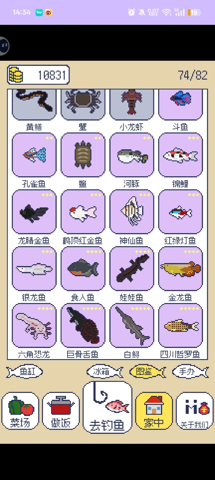 鱼缸里可以放自己喜欢的鱼(为什么鲨鱼会比其他鱼小啊),还可以通过祈祷来获取鱼(这难道不是一种另类的刷钱方式吗),可以得五星鱼(我还傻傻的以为图鉴底下的鱼是通过钓鱼得来的)