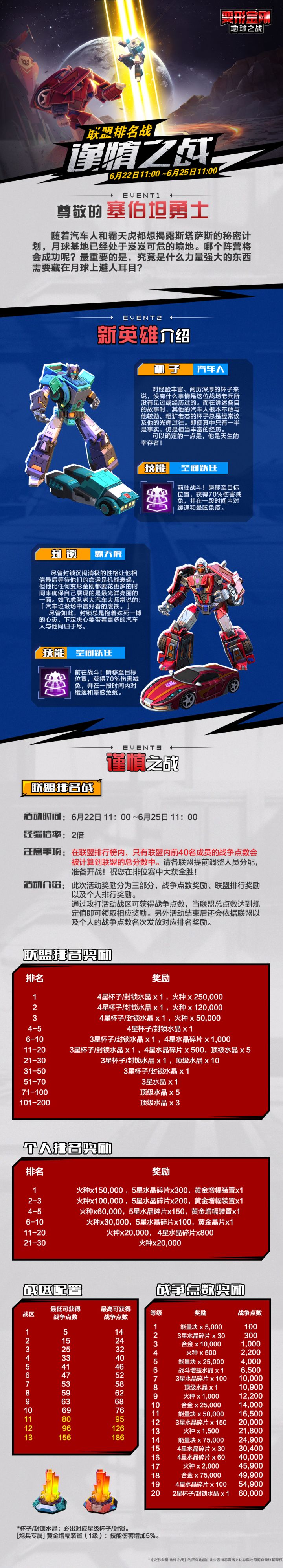 到现在为止国际服共出了三对合体战士,即大力神/大无畏,混天豹/巨神擎天柱,冲云霄/炎龙王(修罗王是民间叫法,今年夏天孩之宝出了机器恐龙合体战士,学名是炎龙王)。前两对也已经登陆国服,技能大家再熟悉不过。大力神/大无畏一个小范围群体技能两个单体技能;混天豹/巨神擎天柱一个辅助技能一个小范围群体技能一个大范围半辅助群体技能。冲云霄/炎龙王技能图附在后面,简单说来就是一个小范围群体技能两个大范围群体