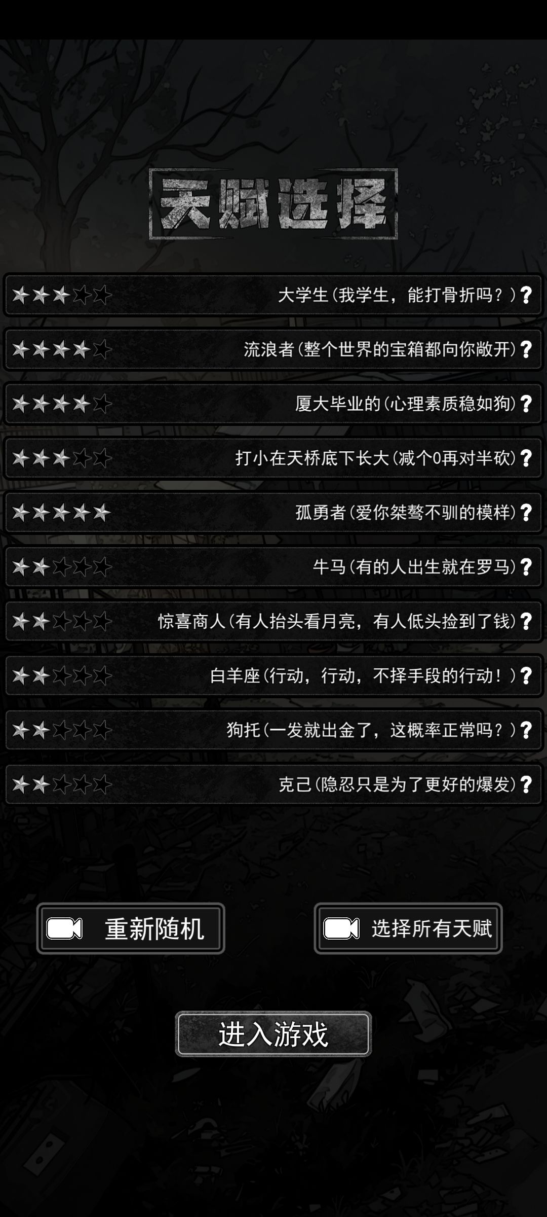 五星真不一定是好天赋,更喜欢带这三个 白羊座:每天行动力额外恢复10点,天赋上限只是上限,每天恢复根本满不了,但是配上白羊座和持续充沛,那行动力简直了,要知道打工有限制,但翻译是没有的啊!也就是,行动力就是钱啊! 烟草局:开局自带5个华子,配上属性宝藏之眼,每次都会翻出华子,相当于白送手镯手表等名贵物品,刀龙是绝对的好人啊! 轮回者:保留这一局最高属性的30%到下一局。 没有轮回者的打工不是工,学