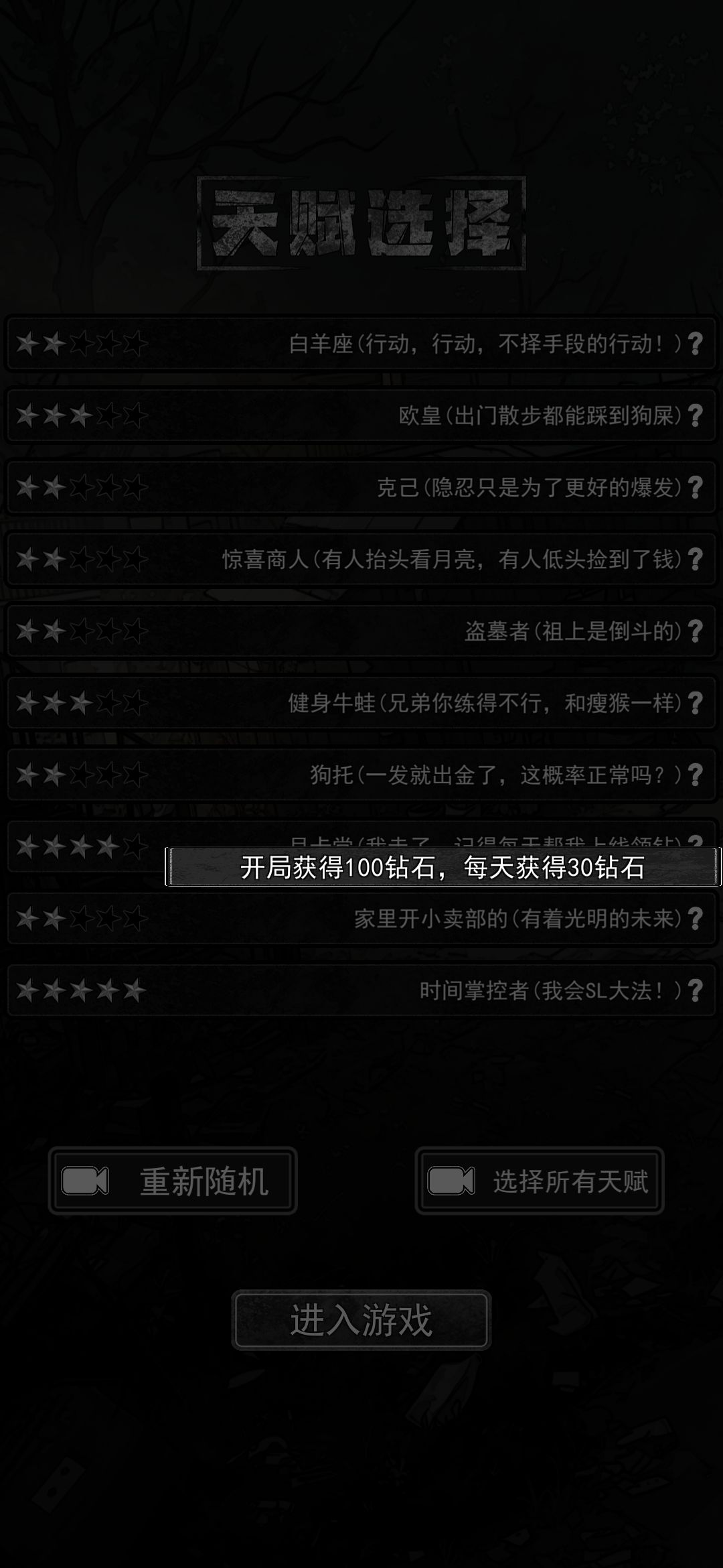 我也没玩多久 这游戏几个小时就通关了 欢迎补充 1:刷轮回币 开局看个广告后点轮回之源 开始游戏直接睡到第三天在小镇去找辰辰告诉回去方法可以直接正常结算(真接放弃不给币)点满轮回之源一次结算有1200 整个过程不到一分钟 挺快的 2:天赋 优先高星但不是什么高星都选 如亡语(增加20%的结算币)没啥用 顶多刷币的时候选下 对 通关没用 推荐五星 首充(看广告获得钱食物香烟)孤勇者(无视20%警戒值