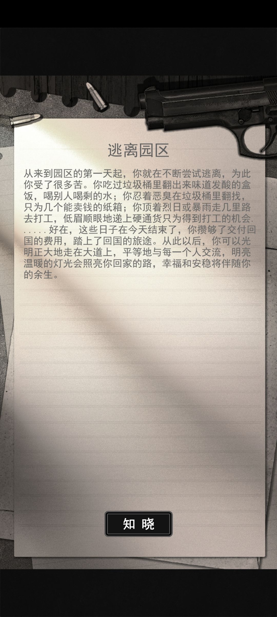 逃离园区: 最普通结局,30日内攒够一万,10日/20日/30日分别提交1000元/2000元/7000元,30日内总共交付够一万即可逃离达成该结局(可以提前交付) 天上不会掉陷阱,陌生来电莫轻信: 失败结局,放弃逃离/高警戒区被抓/钱不够触发 自身失败四结局: ①骗人之心不可有,防骗之心不可无(饿死结局): 饱腹达到0 ②欺诈陷阱戏于指尖,天上馅饼伪如水月(渴死结局): 水分达到0 ③攒钱十年功