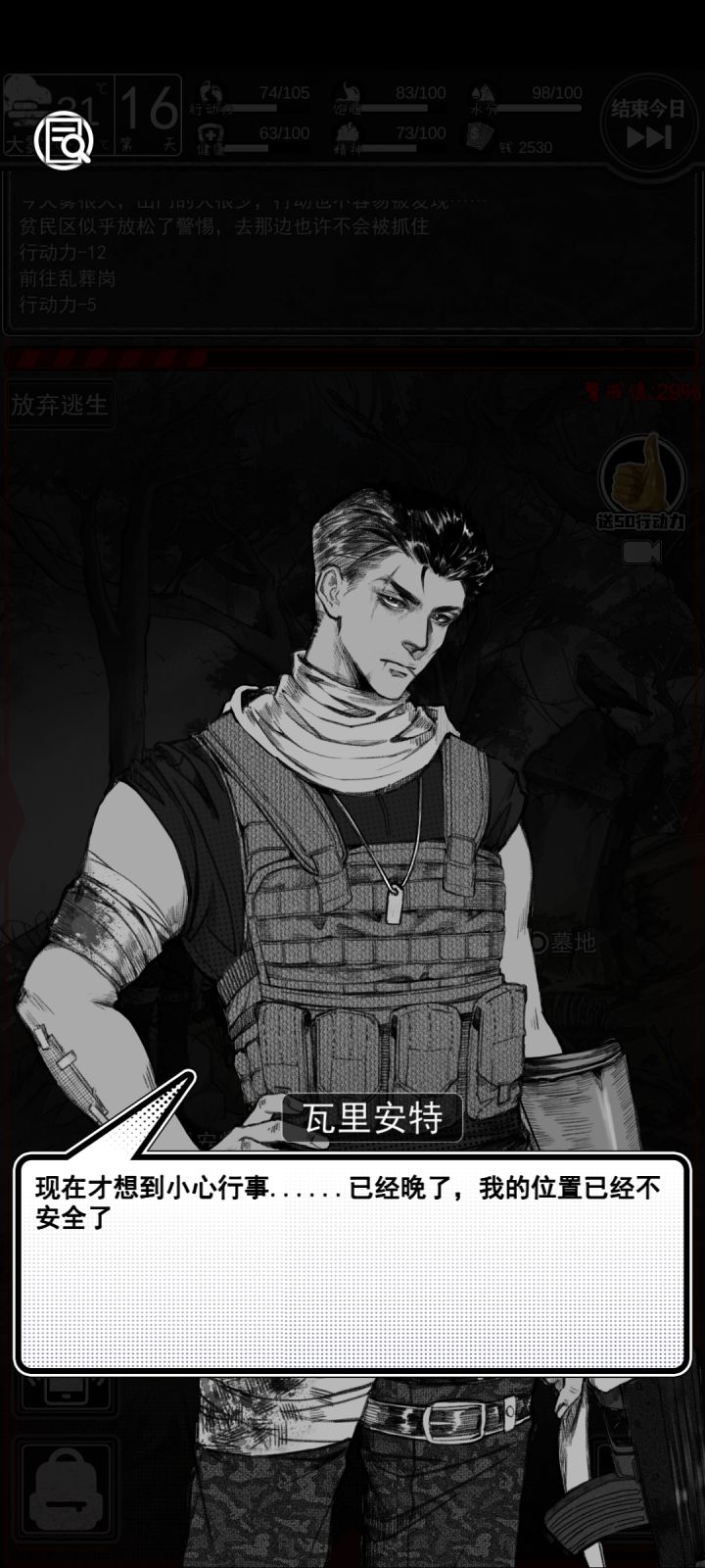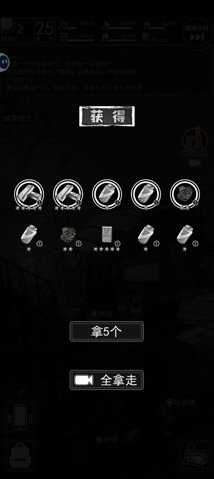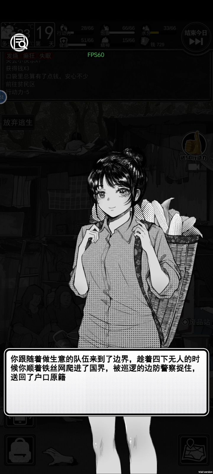 1.翻译工作(花费15体力得到80块钱)在左下角的手机图标里,是第五个软件,不限次数。2.没体力了可以不回家,家里的黑商功能似乎点不开了,目前除了每天早上翻垃圾没别的事要在家里做,补给里显示的东西都是随身携带的,可以不用专门回家使用。3.一个区域内的警戒值达到50及以上之后每次交互点击都有可能被抓。4.小镇区域的躺椅可以免费回复15体力,每天限一次。小镇区域的商店中,便当、水、红牛是必买的,
