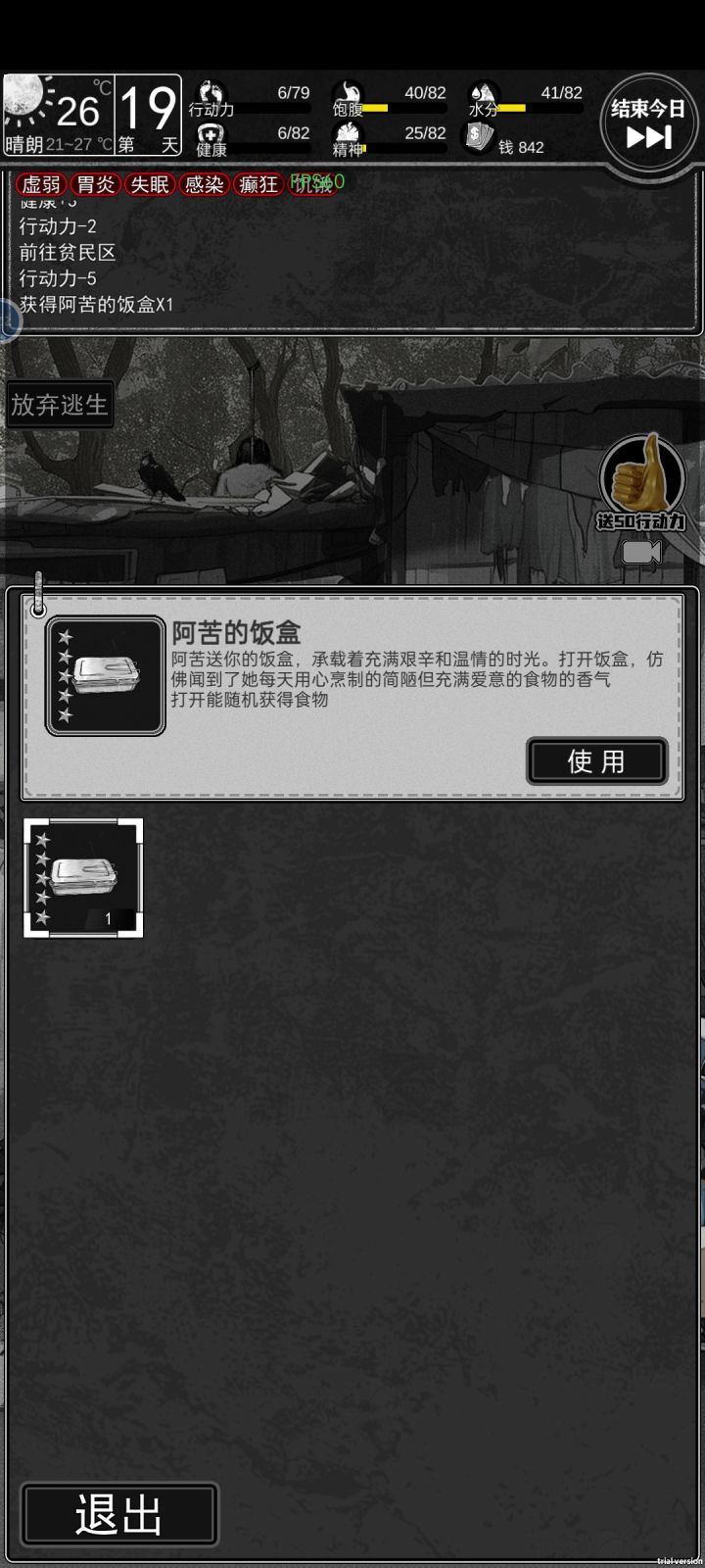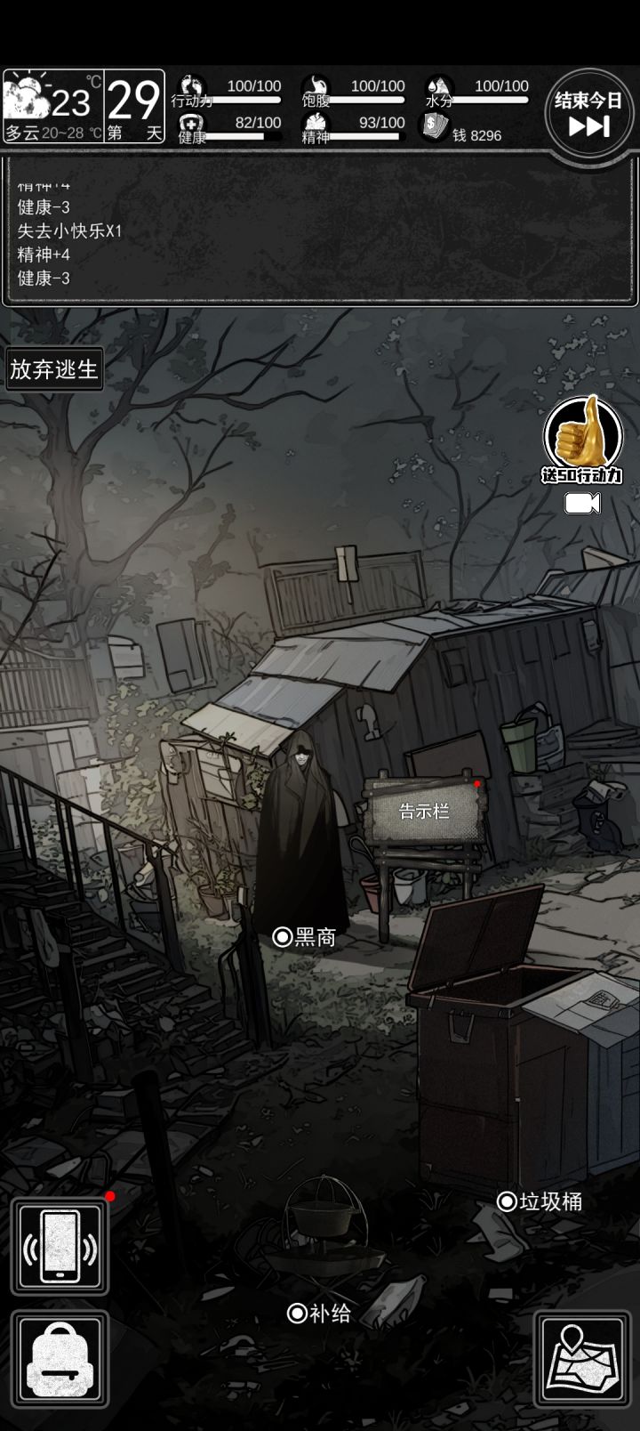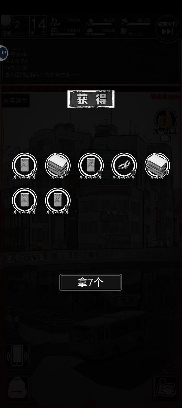 1.翻译工作(花费15体力得到80块钱)在左下角的手机图标里,是第五个软件,不限次数。2.没体力了可以不回家,家里的黑商功能似乎点不开了,目前除了每天早上翻垃圾没别的事要在家里做,补给里显示的东西都是随身携带的,可以不用专门回家使用。3.一个区域内的警戒值达到50及以上之后每次交互点击都有可能被抓。4.小镇区域的躺椅可以免费回复15体力,每天限一次。小镇区域的商店中,便当、水、红牛是必买的,