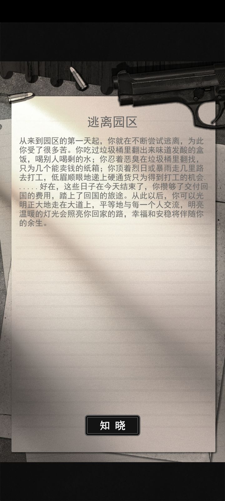 逃离园区:最普通结局,30日内攒够一万,10日/20日/30日分别提交1000元/2000元/7000元,30日内总共交付够一万即可逃离达成该结局(可以提前交付)天上不会掉陷阱,陌生来电莫轻信:失败结局,放弃逃离/高警戒区被抓/钱不够触发自身失败四结局:①骗人之心不可有,防骗之心不可无(饿死结局):饱腹达到0②欺诈陷阱戏于指尖,天上馅饼伪如水月(渴死结局):水分达到0③攒钱十年功