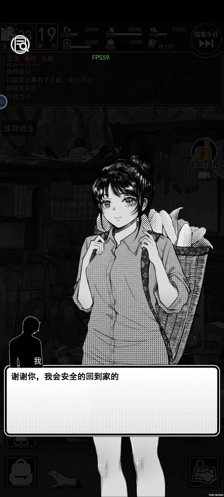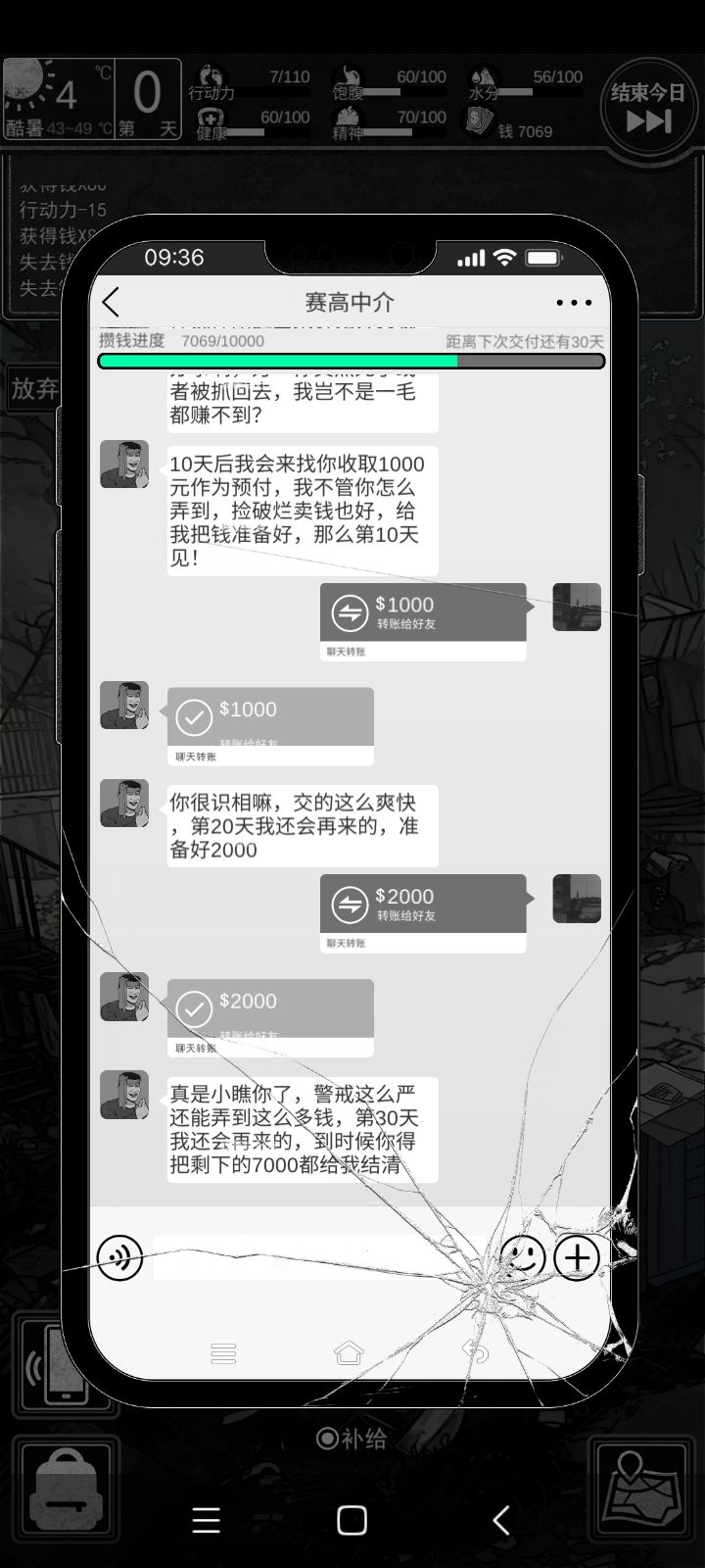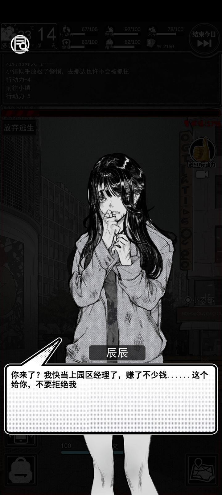 第一局的时候非常善良的,直接把信息泄露给晨晨了。死第二局的时候,因为和晨晨有关系,和斌哥聊着聊着聊崩了。死第三局的时候,避雷晨晨,完全没和她说过一句话,只差一天就能攒够钱了。死第四局的时候,突然意识到一个很严肃的问题叫做,无论是去看场地还是去打灰,还是去做酒保,还是去修车,都不如我翻译挣钱快。15行动力换80元。而在富人区的事情都要花50行动力去挣不到200(因为当时不知道给的价格是属性不足