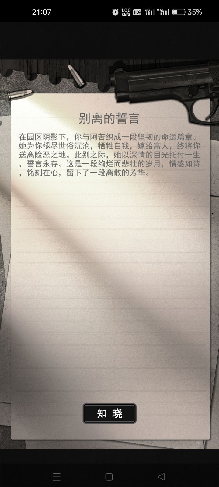 呜呜呜,“接下来的日子你替我走了”阿苦善良的女孩,成就了我玩了半天第一次成功,但是宁愿不成功。牺牲了善良女孩的一生…我宁愿回不去,这条线太杀人诛心了,记得有一把,阿苦突然失踪了,结果旁边的大妈们在讨论阿苦被打死了,真是眼泪要掉下来了,这么好的一个女孩。游戏挺好的,不说了,emo了。#浅评一下#游戏安利#游戏推荐