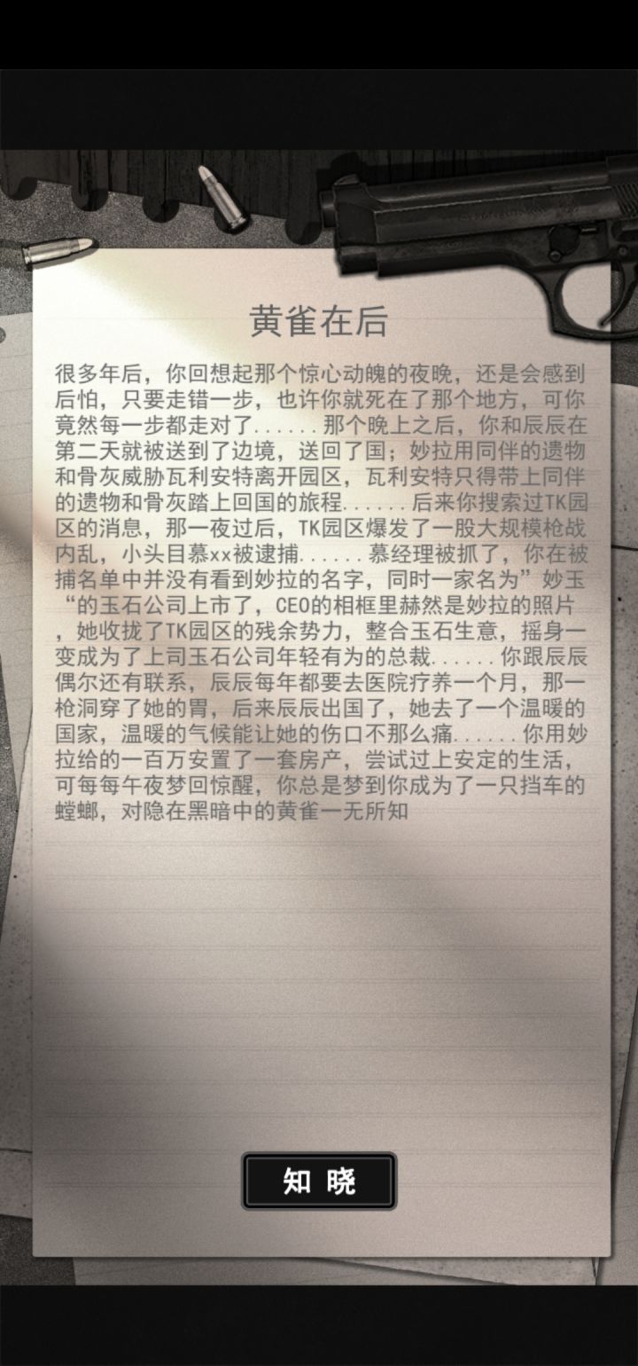 逃离园区:最普通结局,30日内攒够一万,10日/20日/30日分别提交1000元/2000元/7000元,30日内总共交付够一万即可逃离达成该结局(可以提前交付)天上不会掉陷阱,陌生来电莫轻信:失败结局,放弃逃离/高警戒区被抓/钱不够触发自身失败四结局:①骗人之心不可有,防骗之心不可无(饿死结局):饱腹达到0②欺诈陷阱戏于指尖,天上馅饼伪如水月(渴死结局):水分达到0③攒钱十年功