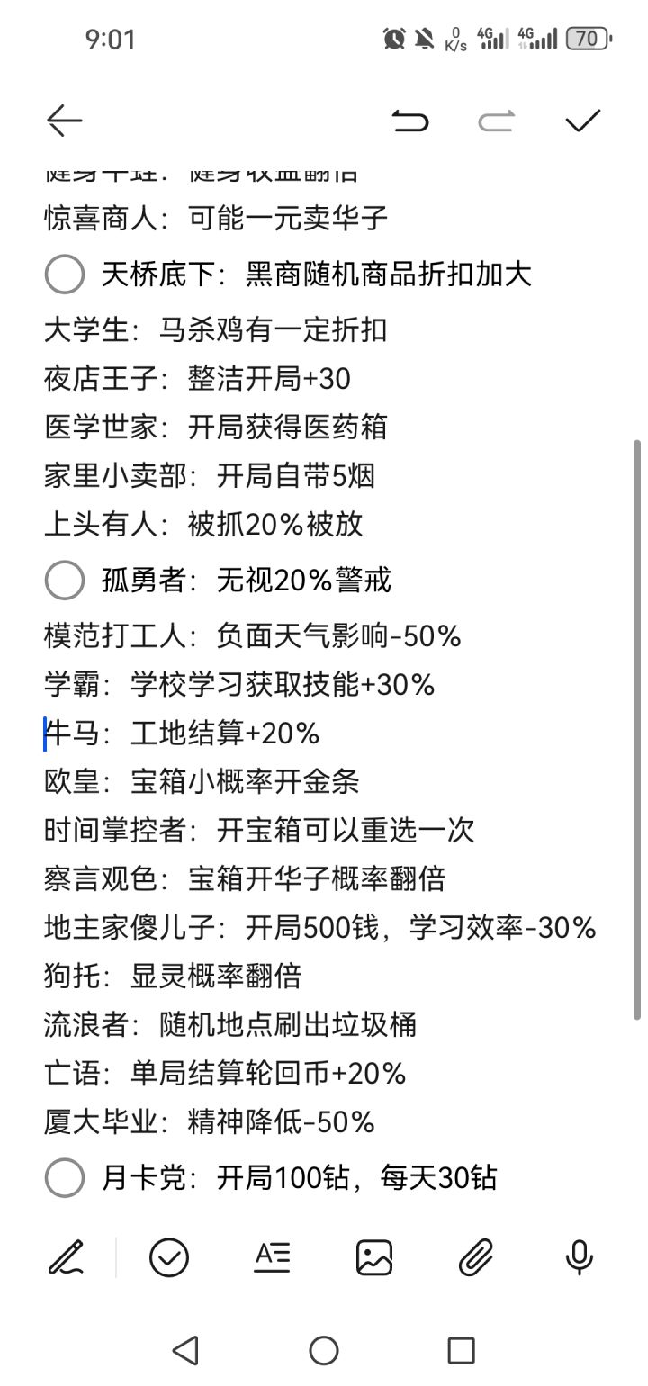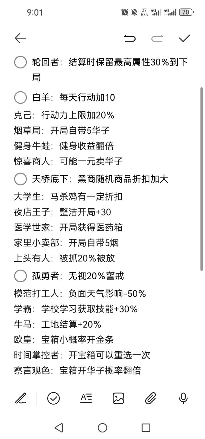 ★★★★★位面之子-单局游戏金手指次数+5亡语-单局结算获得的轮回币20%时间掌控者-每次来宝箱可以选择从新开一 次孤勇者-无视20%警戒值夜店王子-开局整洁+30调虎离山-每天随机两个地点降低警戒值降 低★★★★☆医学世家-开局获得医药箱厦大毕业的-精神降低-50%模范打工人-天气造成的负面效果减少50%月卡党-开局获得100砖石,每天获得30砖石流浪者-每天在随机地点有