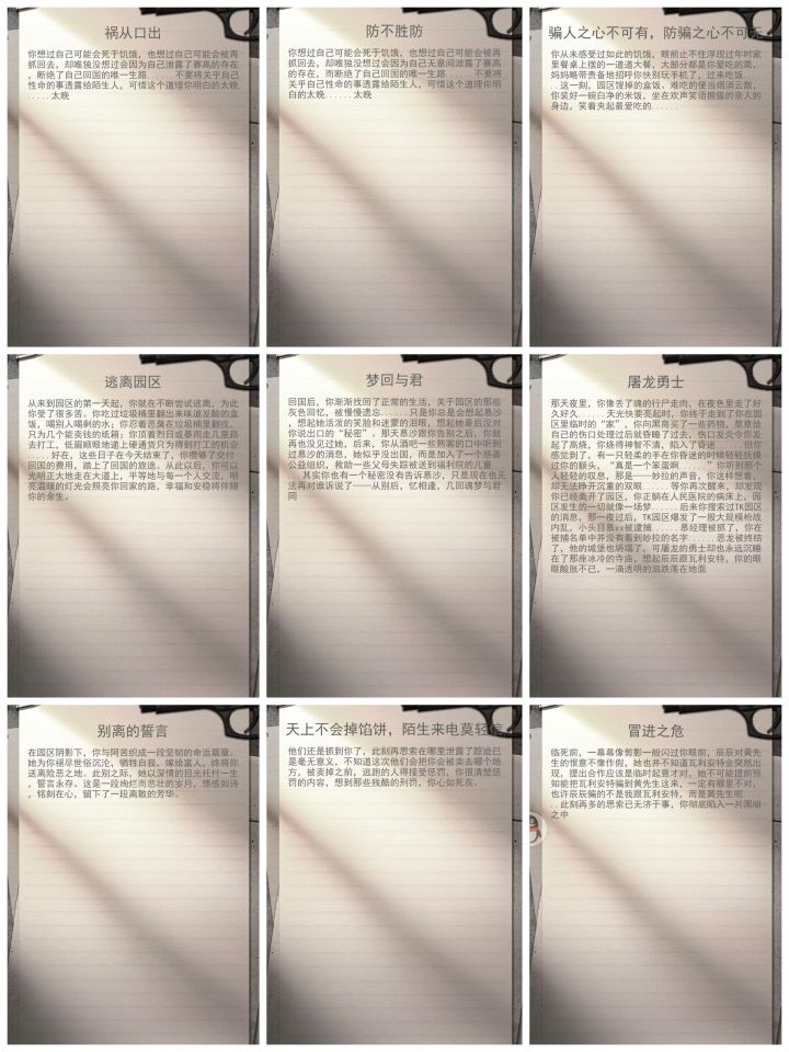逃离园区:最普通结局,30日内攒够一万,10日/20日/30日分别提交1000元/2000元/7000元,30日内总共交付够一万即可逃离达成该结局(可以提前交付)天上不会掉陷阱,陌生来电莫轻信:失败结局,放弃逃离/高警戒区被抓/钱不够触发自身失败四结局:①骗人之心不可有,防骗之心不可无(饿死结局):饱腹达到0②欺诈陷阱戏于指尖,天上馅饼伪如水月(渴死结局):水分达到0③攒钱十年功