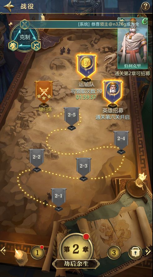 达到50级,领主大人们基本就可以独当一面了,那么在50级之前,需要怎么做才能更完善自身呢? 一、刚进入游戏,跟随新手教程走完,可以了解如何上阵英雄以及一些游戏基础操作。在这个过程中,可以看到第一个免费紫色英雄斯巴达克斯圣城飞奔而来,由于距离太远,需要在次日0点才能收入麾下。 二、接下来跟着主线任务一直走,中途打战役能获得高阶的英雄,招募到就换上,同时领取活动里面的基地升级奖励。