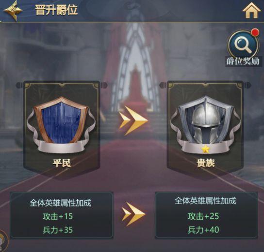 爵位可以增加英雄属性,通过消耗军功、金币、材料可以晋升爵位,增加属性为攻击、防御、兵力。军功可通过阵营建设、阵营任务、商城购买、参与阵营战、城战等途径获取。爵位提升至荣誉骑士后需要蓝色锻造材料才能晋升,可通过港口建筑,使用装备图纸来获得相应材料。#攻略#游戏安利#游戏推荐#游戏讨论#游戏资讯