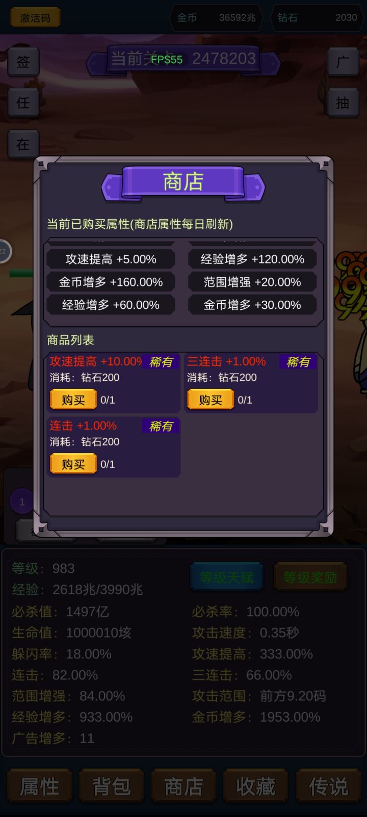 这玩意生命值后期没一丁点用啊,只有买前两三个收藏的时候有点用,秒杀值买满也就毕业了,别的数值再升也没有提升空间。消极每天只收菜一次,不怎么看广告,历时16天。攻略:经验升级点全加“获得金币”,优先买收藏,然后金币升级“必杀值”,零头升级“获得金币”。商店每天搬空没啥可说的。宝藏给的金币加成实在不多,没必要有多关注,其他属性更是没发现有用处,所以广告酌情看就行。离线金币量貌似比在线更高,没必