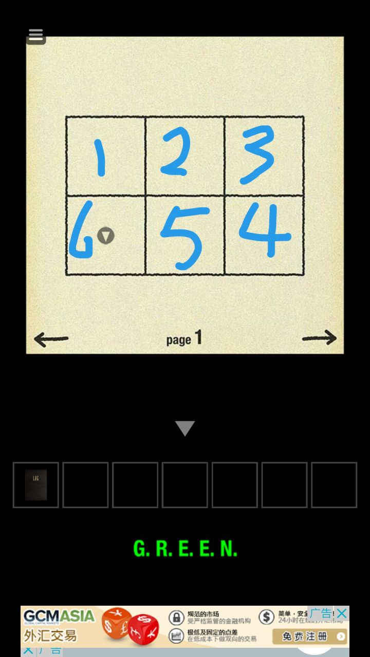 初始画面左转看到英文GUARDIAN,再左转进去点椅子拿到书本,打开看到图,把6个房间标记下如图1我们现在在6号房间,看到英文ENIGMA,后退右转看到5/6,继续右转出去,右转进画到2号房间,在2号房间转一圈,把地上有凹陷的砖块都点一遍,并且看到英文REIGN,3/5,拿到一三角立方体,点三角立方体底部看到4个刻印,找到对应的砖块放上。 再右转进画框到5号房间,转一圈看到英文NODE,拿走圆锥