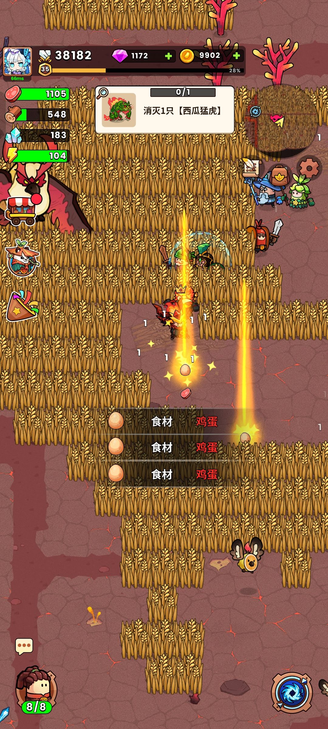 在稻海,用南瓜+红豆合成镰刀精通就可以开割 随机掉落水稻和鸡蛋,时不时还有小怪的柠檬,或者boss的雪梨[表情_斜眼笑]