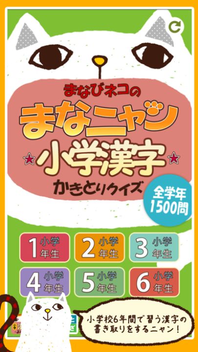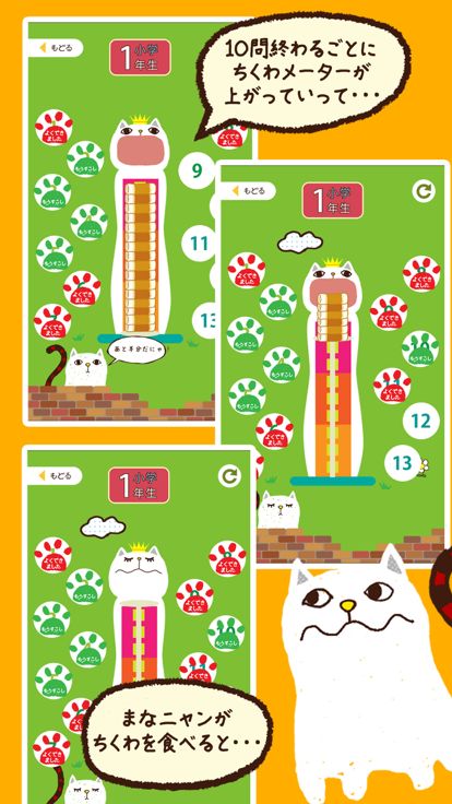 メニューは学年ごとに分かれていて、1回につき10問を出題。1問ずつ出される漢字を、まなニャンのおなかに書いていきます。正解の場合はまなニャンがちくわを食べることができて満足、不正解の場合はちょっと不機嫌です。1問につき10秒の持ち時間内で答えましょう。時間は並んだ鈴が知らせてくれます。