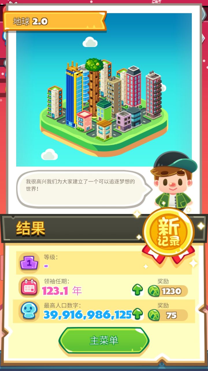 开始按正常流程玩到50几年,人口10B+发现不能控制环境污染,一直在1万6以上再不能降低了于是有意的让人口降低,好把所有免费建筑拆了环境也终于好转了,开始发展人口,可是人口增长太快,超过10B一瞬间环境又变差了好在这次全是绿色建筑,环境还是可控的这样子,如果有时间就可以一直玩下去了,只要控制人口不要超过25B到100年了,但是这游戏连存档功能都没有,一退出就要重新开始,最终决定