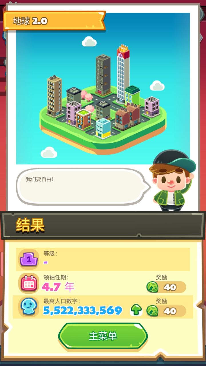 开始按正常流程玩到50几年,人口10B+发现不能控制环境污染,一直在1万6以上再不能降低了于是有意的让人口降低,好把所有免费建筑拆了环境也终于好转了,开始发展人口,可是人口增长太快,超过10B一瞬间环境又变差了好在这次全是绿色建筑,环境还是可控的这样子,如果有时间就可以一直玩下去了,只要控制人口不要超过25B到100年了,但是这游戏连存档功能都没有,一退出就要重新开始,最终决定
