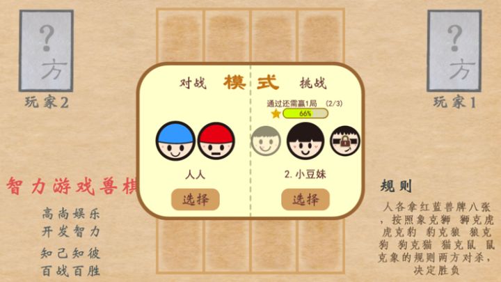 游戏规则:“人各拿红蓝兽牌八张,按照象克狮 狮克虎 虎克豹 豹克狼 狼克狗 狗克猫 猫克鼠 鼠克象的规则两方对杀,”。