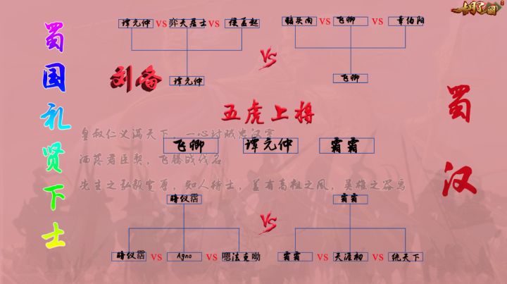 比赛时间:2019年8月29日19:00比赛规则:报名的前12名玩家,进行随机分组淘汰赛,最终前3名玩家成为“五虎上将”,加入蜀国战队,在最终的三国秋季大战中代表蜀国战队出战。比赛奖品:最终获得三国大战胜利的战队,队内所有队员都将得到300军粮2000军功10000金币以及每人将获得阿根廷黄金一代进口甜白葡萄酒一瓶。报名方式:加入胡了三国官方QQ群:565354416联系司马仲达进行报名。