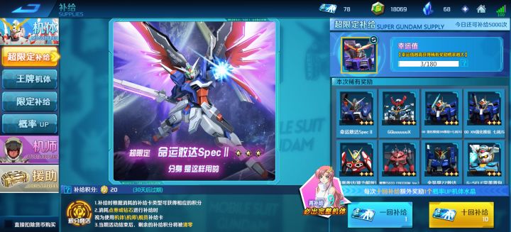 首先以现在的游戏福利,萌新在前期可以拿下一个超限定机体,以下是我的个人经验分享: 萌新进入游戏后在新手教程强制导引结束(大概是等级5到7级左右,根据新手教程可以很快上手且等级提升快,注:这个结束是等级达到,放开部分限制功能并做导引,在15级后完全放开)先兑换兑换码:KUAILE2026和YUANDAN2026,这两个兑换码分别有两个888点券。然后在特惠每月礼包那里用1080点券换机体补给卡,每