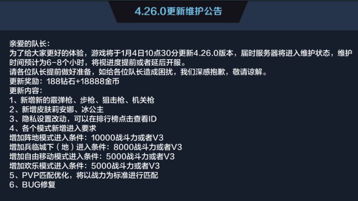 亲爱的队长:为了给大家更好的体验,游戏将于1月4日10点30分更新4 .26.0版本,届时服务器将进入维护状态,维护时间预计为6- 8个小时,将视进度提前或者延后开服。请各位队长提前做好准备,如给各位队长造成困扰,我们深感抱歉,敬请谅解。更新奖励: 188钻石+18888金币更新内容:1、新增新的霰弹枪、步枪、狙击枪、机关枪2、新增皮肤莉安娜、冰公主3、隐私设置改动,可以在排行榜点击