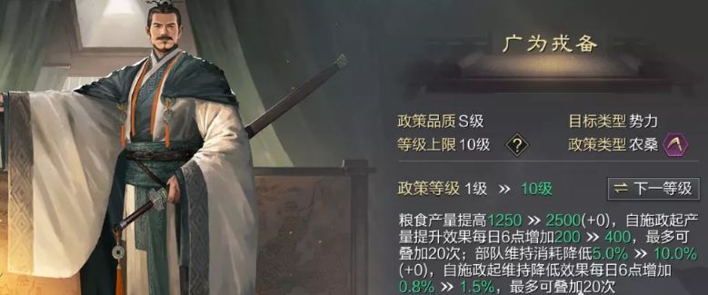 同一个武将,有的人用他带兵打仗,也有人转文臣用内政,到底怎么用,还是要根据你队伍的搭配而定,另外玩流浪军的方向风格不同,选择内政也会有很大的差别,以下仅做参考。 1、司马炎(推荐:五星) 第一内政,增加要塞补给范围+1和士气,可考虑搭配荀彧、荀攸,补给范围+2,但由于流浪军一般只用4个内政槽,所以通常单上一个司马炎就够了。 2、杨祜(推荐:五星) 当前版本单加粮食产量以及降低粮食消耗上限最高的内