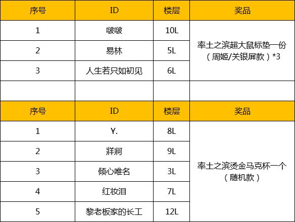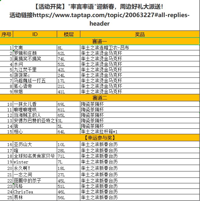 "率言率语"迎新春,周边好礼大派送!活动顺利结束,感谢各位大人的参与,让我们恭喜以下幸运玩家获得奖励! 【发奖流程&注意事项】 请获奖的玩家在七个工作日内按照本账号回复的内容提供以下信息 活动名称: 姓名: 电话: 地址: 中奖评论界面截图: 如有问题可随时咨询该QQ:851372967 即日起至2022年2月25日截止,若未在规定时间内回复信息及地址等相关信息提供不详细无法发放奖品,我们将遗憾视