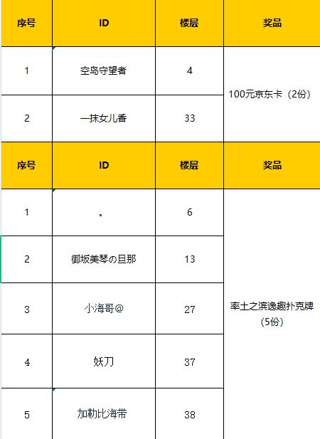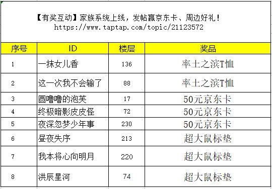 【有奖互动】家族系统上线,发帖赢京东卡、周边好礼!活动顺利结束,感谢各位大人的参与,让我们恭喜以下幸运玩家获得奖励! 【发奖流程&注意事项】 请获奖的玩家在七个工作日内按照以下要求把信息发送到 1123585502@qq.com 活动名称: 姓名: 电话: 地址: 中奖评论界面截图: 如有问题可随时咨询该QQ:1123585502 即日起至2022年8月11日截止,若未在规定时间内回复信息及地址等