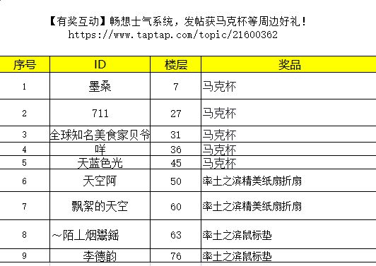 【有奖互动】畅想士气系统,发帖获马克杯等周边好礼!顺利结束,感谢各位大人的参与,让我们恭喜以下幸运玩家获得奖励! 【发奖流程&注意事项】 请获奖的玩家在七个工作日内按照以下要求把信息发送到 1123585502@qq.com 活动名称: 姓名: 电话: 地址: 中奖评论界面截图: 如有问题可随时咨询该QQ:1123585502 即日起至2022年10月8日截止,若未在规定时间内回复信息及地址等相关