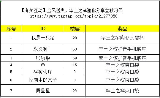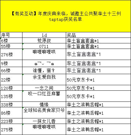 【活动开奖】年度庆典来临,诚邀主公共聚率土十三州 顺利结束,感谢各位大人的参与,让我们恭喜以下幸运玩家获得奖励! https://www.taptap.cn/topic/21757122 【发奖流程&注意事项】 请获奖的玩家在七个工作日内按照以下要求把信息发送到 1678641326@qq.com 活动名称: 姓名: 电话: 地址: 中奖评论界面截图: 如有问题可随时咨询该QQ:167864132