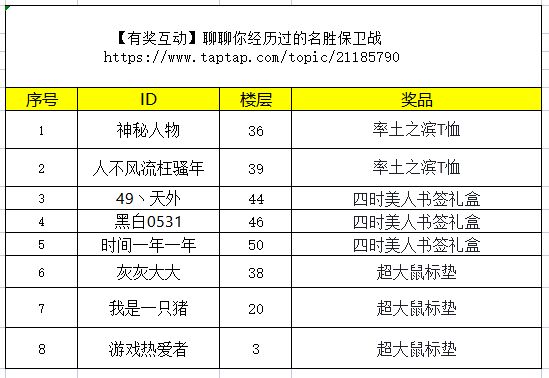 【有奖互动】聊聊你经历过的名胜保卫战顺利结束,感谢各位大人的参与,让我们恭喜以下幸运玩家获得奖励! 【发奖流程&注意事项】 请获奖的玩家在七个工作日内按照以下要求把信息发送到 1123585502@qq.com 活动名称: 姓名: 电话: 地址: 中奖评论界面截图: 如有问题可随时咨询该QQ:1123585502 即日起至2022年9月9日截止,若未在规定时间内回复信息及地址等相关信息提供不详细无