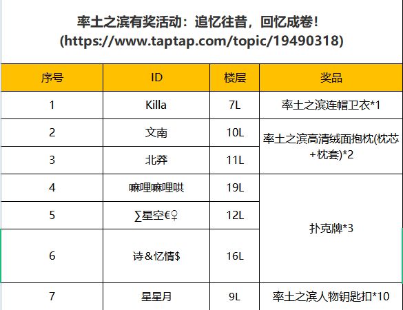 周年庆活动已顺利结束,感谢各位大人的参与,让我们恭喜以下幸运玩家获得奖励! 1.率土之滨有奖活动:追忆往昔,回忆成卷! 2.有奖活动:邀各位主公共商内政,分享政策系统体验与心得! 【发奖流程&注意事项】请获奖的玩家在7个工作日内按照本账号回复的内容提供以下信息 活动名称: 姓名: 电话: 地址: 中奖评论界面截图: 如有问题可随时咨询该QQ:392924021。 即日起至2021年11月26日截止