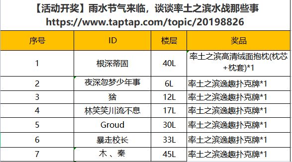 雨水节气来临,谈谈率土之滨水战那些事!活动顺利结束,感谢各位大人的参与,让我们恭喜以下幸运玩家获得奖励! 【发奖流程&注意事项】 请获奖的玩家在五个工作日内按照本账号回复的内容提供以下信息 活动名称: 姓名: 电话: 地址: 中奖评论界面截图: 如有问题可随时咨询该QQ:1452230955 即日起至2022年3月11日截止,若未在规定时间内回复信息及地址等相关信息提供不详细无法发放奖品,我们将遗