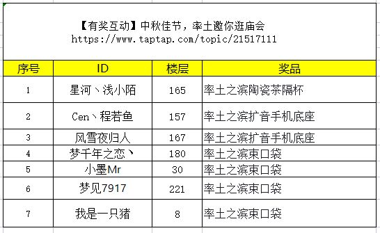 【有奖互动】中秋佳节,率土邀你逛庙会顺利结束,感谢各位大人的参与,让我们恭喜以下幸运玩家获得奖励 【发奖流程&注意事项】 请获奖的玩家在七个工作日内按照以下要求把信息发送到 1123585502@qq.com 活动名称: 姓名: 电话: 地址: 中奖评论界面截图: 如有问题可随时咨询该QQ:1123585502 即日起至2022年9月21日截止,若未在规定时间内回复信息及地址等相关信息提供不详细无