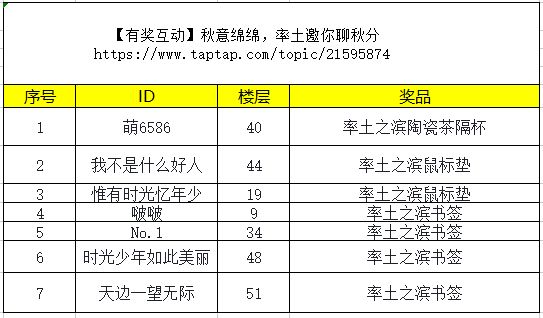 【有奖互动】秋意绵绵,率土邀你聊秋分顺利结束,感谢各位大人的参与,让我们恭喜以下幸运玩家获得奖励! 【发奖流程&注意事项】 请获奖的玩家在七个工作日内按照以下要求把信息发送到 1123585502@qq.com 活动名称: 姓名: 电话: 地址: 中奖评论界面截图: 如有问题可随时咨询该QQ:1123585502 即日起至2022年10月6日截止,若未在规定时间内回复信息及地址等相关信息提供不详细