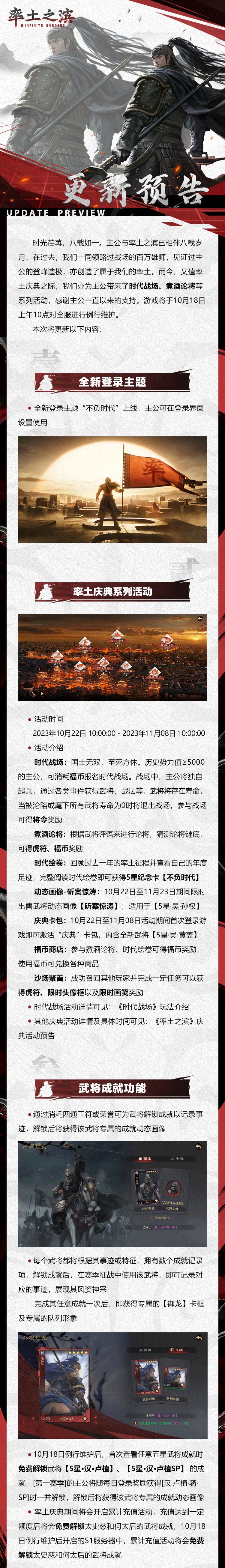 《率土之滨》10月18日例行更新预告 《率土之滨》「时代战场」玩法介绍:https://www.taptap.cn/moment/461961495287169055 《率土之滨》庆典活动预告:https://www.taptap.cn/moment/461580290305821762