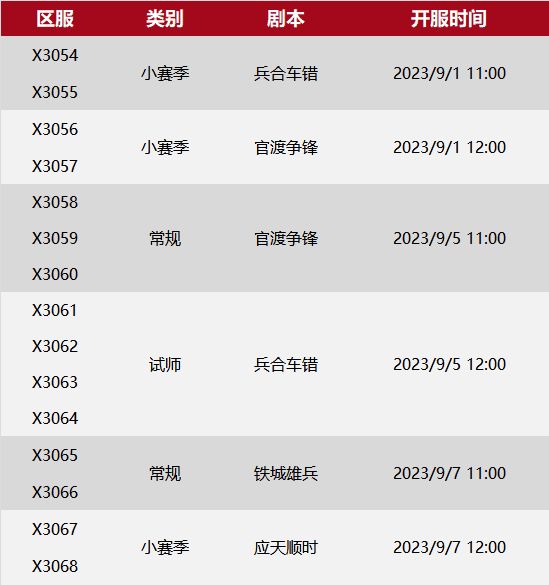 9月1日至9月7日,率土之滨征服赛季开放X3054-X3068六个批次共计15个区服。本周前线有哪些情报呢,《新赛季速报》马上送达! 9月1日上午11点,X3054-X3055两个兵合车错小赛季开启。 X3054前线情报: 【聚盟】三州齐开,【桃子】双管齐下,【学生】也强势地与二者比肩,形成了三足鼎立的局势。 据小道消息,青冀与益州势力,有联手的可能。 X3055前线情报: 【鹅城