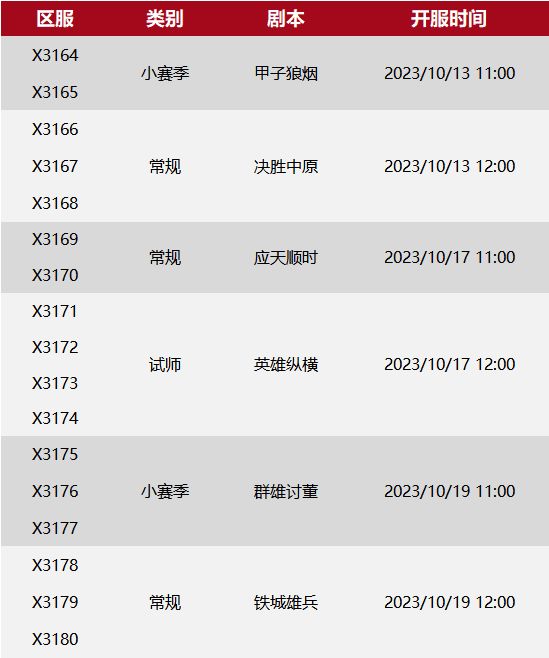 10月13日至10月19日,率土之滨征服赛季开放X3164-X3179六个批次共计16个区服。本周前线有哪些情报呢,《新赛季速报》马上送达! 10月13日上午11点,X3164-X3165两个甲子狼烟小赛季开启。 X3164前线情报: 东汉朝廷威严不减,在【恶贯满盈】与【朝天阙】的夹击下,【剑气】与【黄天】这些黄巾军小队,没有掀起太大的风浪。 10月20日,徐州【恶贯满盈】抢下〖莒〗关