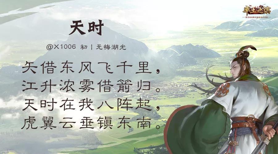 十三州的古代气象战已随着 新《应天顺时》副本的开区而火热展开 全新祭坛玩法的加入 使天气的玩法变得更多样 战场的变数更大 期待已久的主公去体验了一番之后马上以诗词的形式带来了反馈 让我们一起跟着主公的诗词来感受天时版本的刺激吧! 来评论区分享分享吧!感谢以上主公的投稿! 诗词意境壮阔 把古代气象战描绘地淋漓尽致 利用好了天气 定能让战争事半功倍 如果主公们在全新的《应天顺时》赛季中 身处劣势时 准