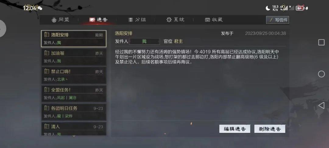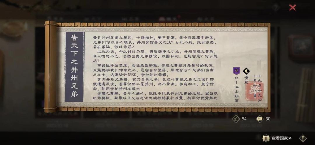 《率土之滨》西北地域服第一赛季进程接近尾声,进入最后阶段。率哥携史官为主公们送上本周的地域服情况! 【4019臊子面】速报 上期说到,扬青凉三盟展开合谈整合,备战下赛季。以【花间钰】为征服盟壳,【凌烟小居】、【风雨雄霸天下】为割据盟壳,组成御三家。 三盟整合,也宣告着本区进入和平友谊赛阶段,御三家也将在后续进行友谊赛、战时功勋、打城等情况来考核征服、割据人员。 但4019区这次可是玩到了真