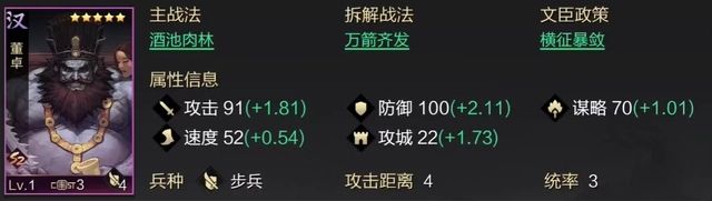 ①面板属性汉董卓的各项属性都比较一般,没有特别突出的地方,不过考虑到他的定位是一个前排肉盾,自带战法也是受防御属性影响,且防御成长还能看的过去,这个属性勉勉强强算是合格。②自带战法汉董卓的自带战法酒池肉林属于一类指挥战法,看到这个战法,很多人都会想到避其锋芒,不过从实战来看,酒池肉林的效果明显是要强于避其锋芒的。首先酒池肉林的效果对己方全体生效,而避其锋芒只对己方群体生效。 至于酒池肉林的后续伤害