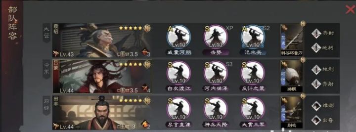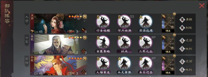 前几回合内,大乔在形兵加持下有伤害并且自带回复;而前锋严颜配合形兵的加成后,坦度非常高;加上大营孙权的保护和解控,令这个队伍又肉又输出。
