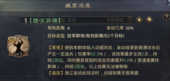 逍遥津,有效距离是4;瞬发;发动率是30%;逍遥津的效果有两部分:使敌军2人陷入动摇状态,发动普攻、或受到普攻后受到伤害率125%的伤害,最多生效两次,动摇状态只持续两回合。张辽发动此战法时,动摇效果无视规避注解:因为,威震逍遥在释放的时候,先施加“动摇效果“,再施加增伤效果,有这样一个先后顺序。所以连续两回合释放逍遥津的时候逍遥津可以自我刷新,假设第一回合释放逍遥津,在施加动摇效果的