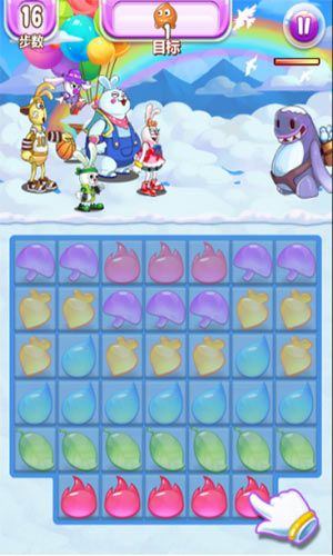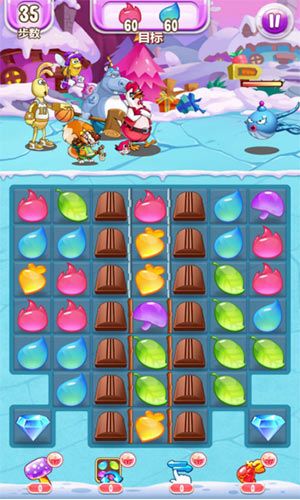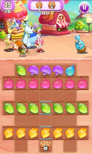 第13关,红色横向、蓝色竖向、紫色变色要求:25步内消除6个贪吃怪和一个宝箱每个宝箱如果按元素消除是需要三次才能消除,如果是竖向就会很方便了,使用蓝色元素触发竖向即可轻松完成。第14关,红色横向、蓝色竖向、紫色变色要求:24步内消除6个贪吃怪这一关的重点在于右侧的两颗炸弹和底部的一颗炸弹,只要牵引到它们就可以满屏炸开花。第15关,红色横向、蓝色竖向、紫色变色要求:18步内消除6个贪吃
